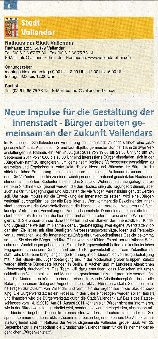 Durchgeführt wird die Bürgerwerkstatt Vallendar im August und September 2011 vom
