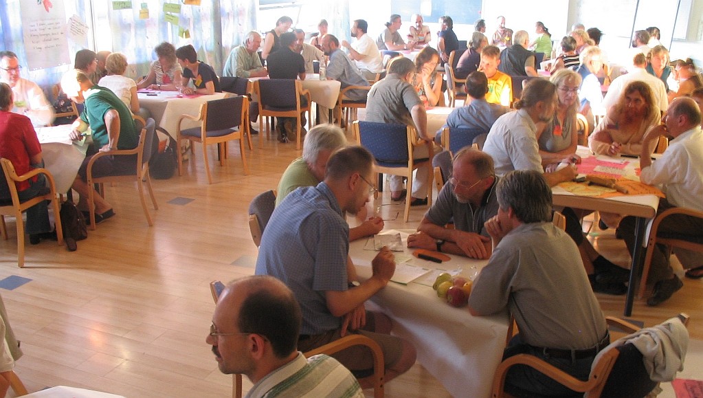 Eine Zukunftswerkstatt ist ein methodisch angeleiteter Entwicklungsprozess. Im Wechsel zwischen Plenum und Kleingruppen werden Ergebnisse kontinuierlich ausgestauscht. Jede Präsentation macht neugierig auf die Gedanken anderer, und mancher fühlt sich geneigt, an weiteren Tischen mitzuwirken.