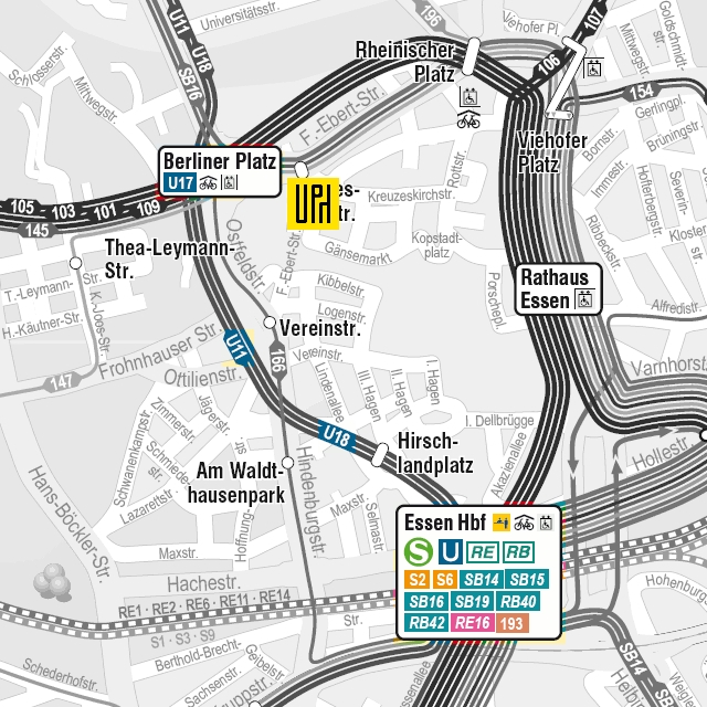 am Markt nach links zum Kornmarkt und durch die Limbecker Str. gehen. Oder die U-Bahn-Linien U11, U17, U18