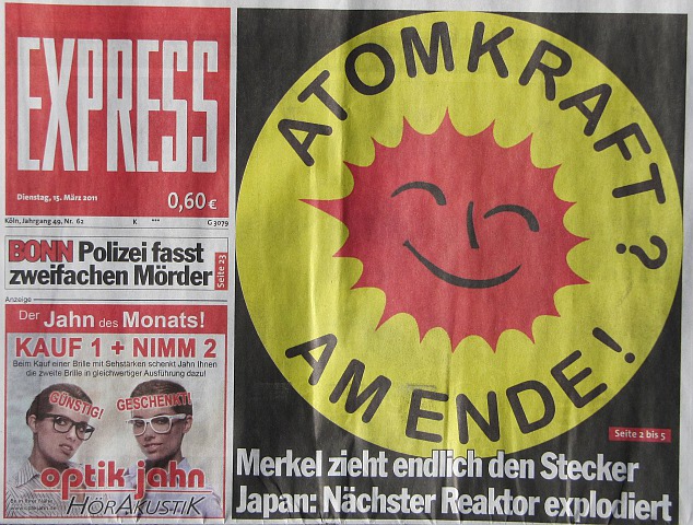 15.3.2011 aus Köln: "Merkel zieht endlich den Stecker", titelte ein Kölner Boulevardblatt. Das mahnt