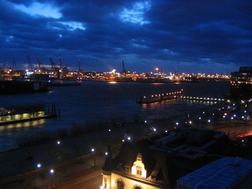 warten bei rauhem Wind im Hamburger Hafen auf die Fähre.